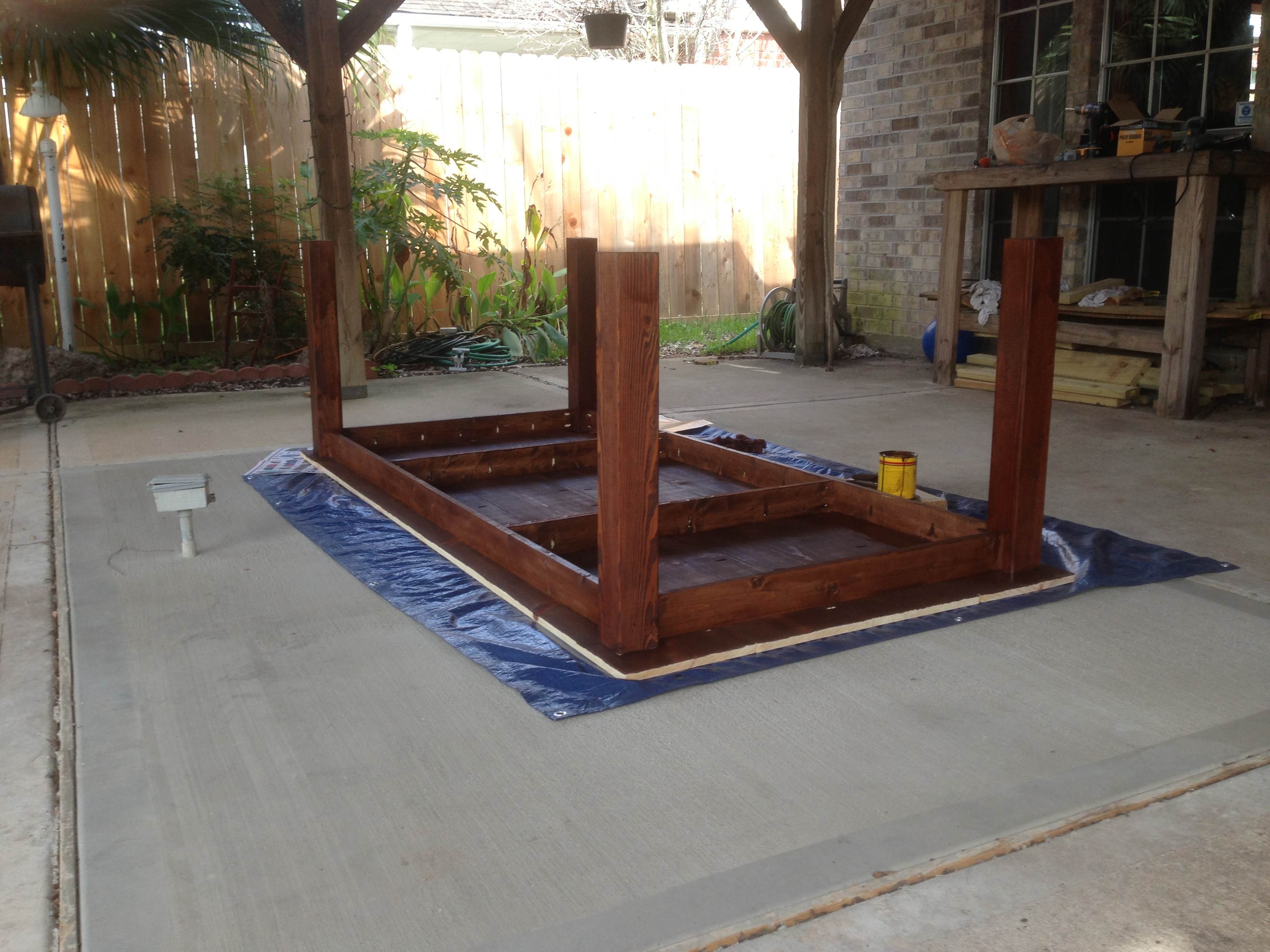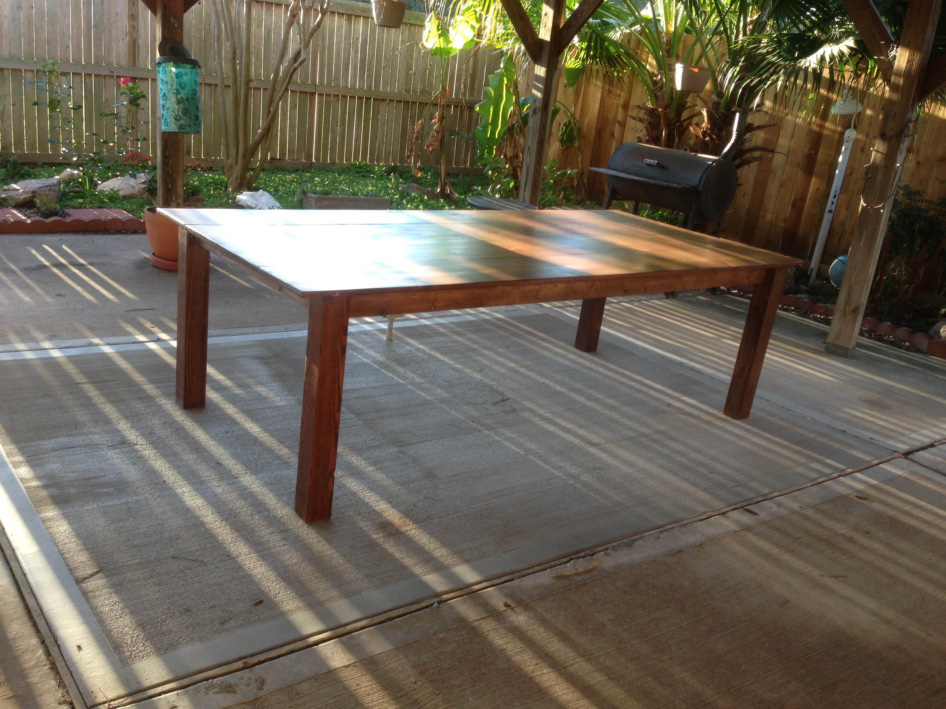 The table is 8 feet long by 4 feet wide and it sits about 30 inches off the ground. It was a pretty simple build using 4×4’s for the legs, 1×12’s for the table top and 1×4’s for the frame underneath. All of it was joined together using pocket hole screws. It’s recommended to use wood glue for the joints to make ’em stronger, but for some reason I skipped that part. The only time consuming step was staining and sealing it due to the waiting time between coats.