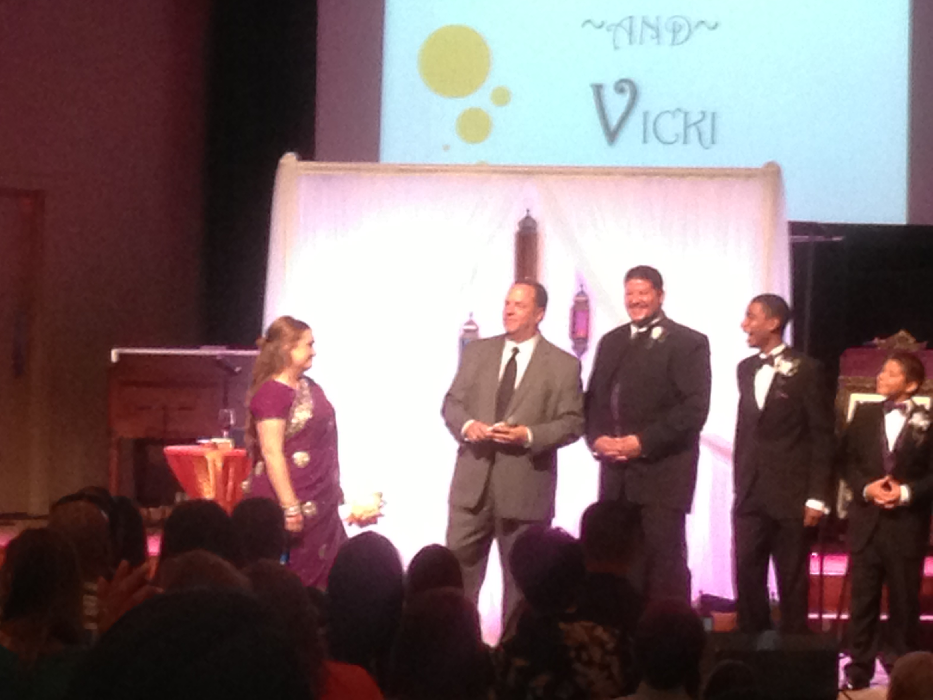 Vicki didn’t run with a traditional wedding gown, but rocked a sari! Her groom waited with his sons to join ’em on stage.