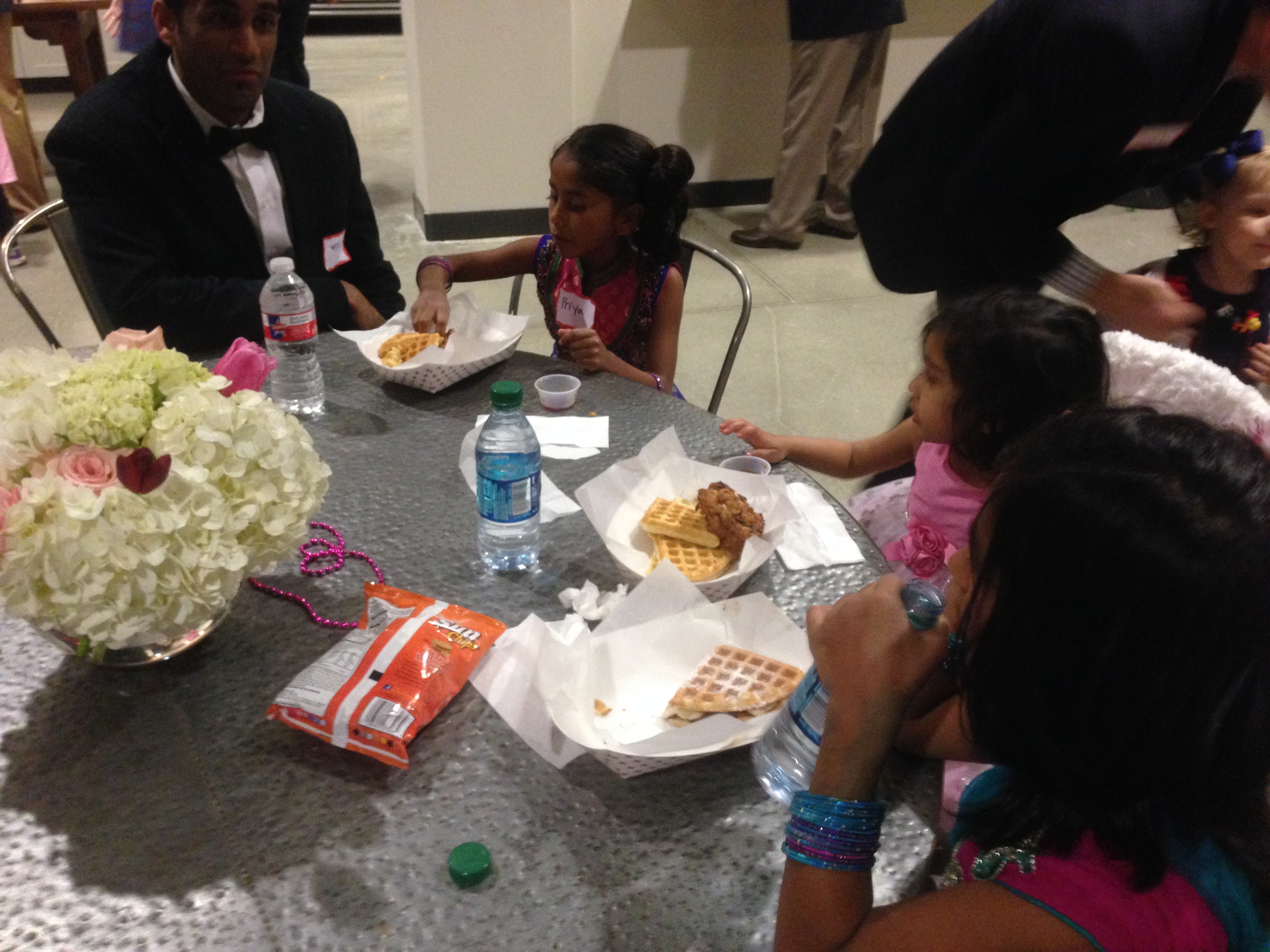 Layla and I went to a Daddy/Daughter Dance on Friday night. My cousin Wes told me about it and was taking his girls there, so I thought it’d be fun to join them. Layla loves hanging out with Priya and Hope, plus we’ve never done a Daddy/Daughter dance before, so I figured, might as well give it a try. It was at Grace Bible Church (which, by the way, is a beautifully designed building). The people were so friendly and the set up was really nice! They had a dance floor in an outside patio, the Waffle Bus was there serving up Chicken and Waffles, there was a photo booth with fun props to pose with, and not to mention a table full of sweets. It was all really well put together.
