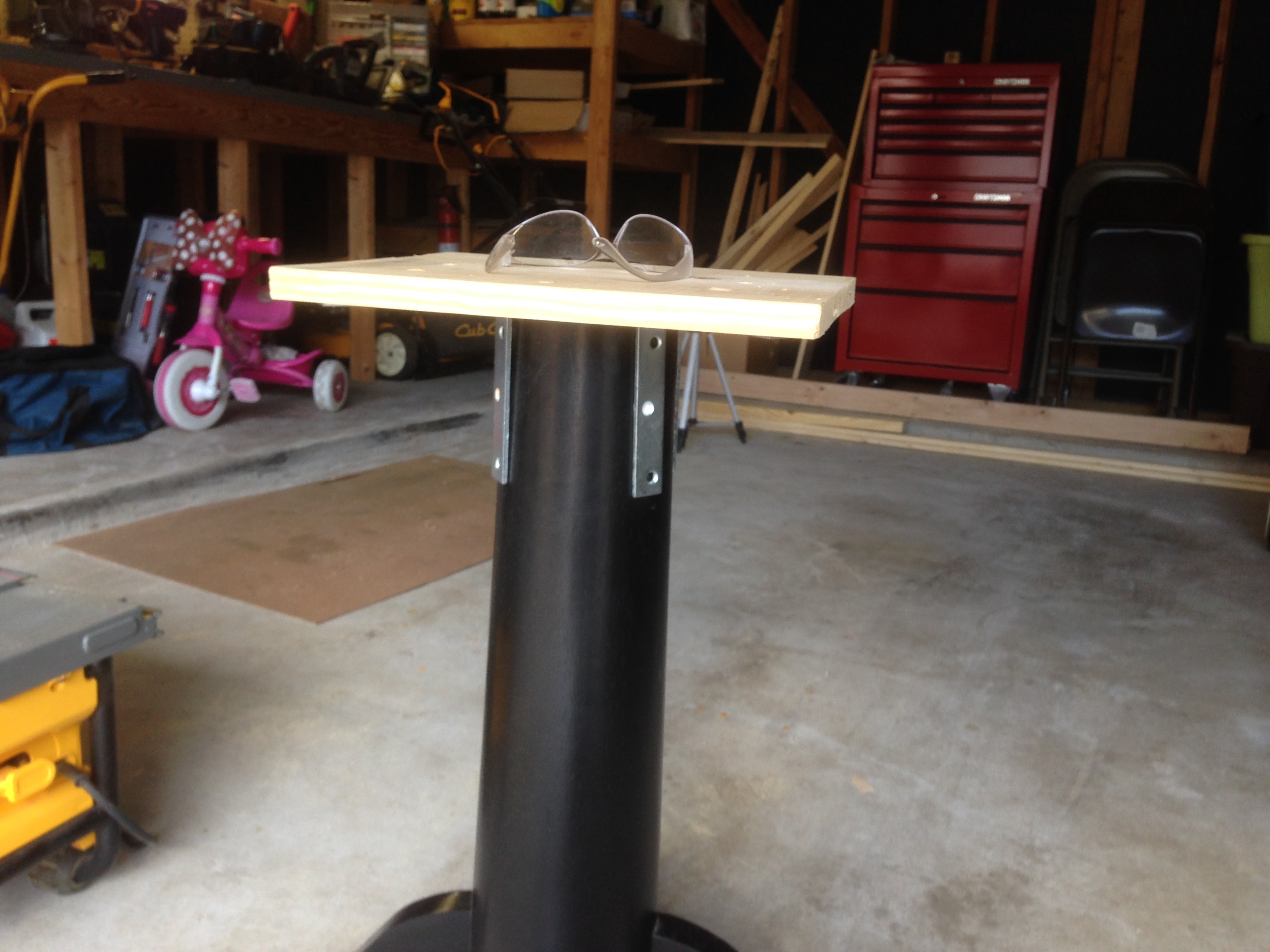 This was before we had kids and it was when we moved into our second house. It fit our needs at the time and we really enjoyed it. Now that we’re in our new house and we have 2 kids that like to climb things, a counter height table just didn’t fit our needs/wants. Also, I had to do a ghetto fix shortly after I bought the table because it was cheap and got weak after some guests had leaned on the table top. I added some “L” brackets to bring additional support on the connection between the leg and the base plate.