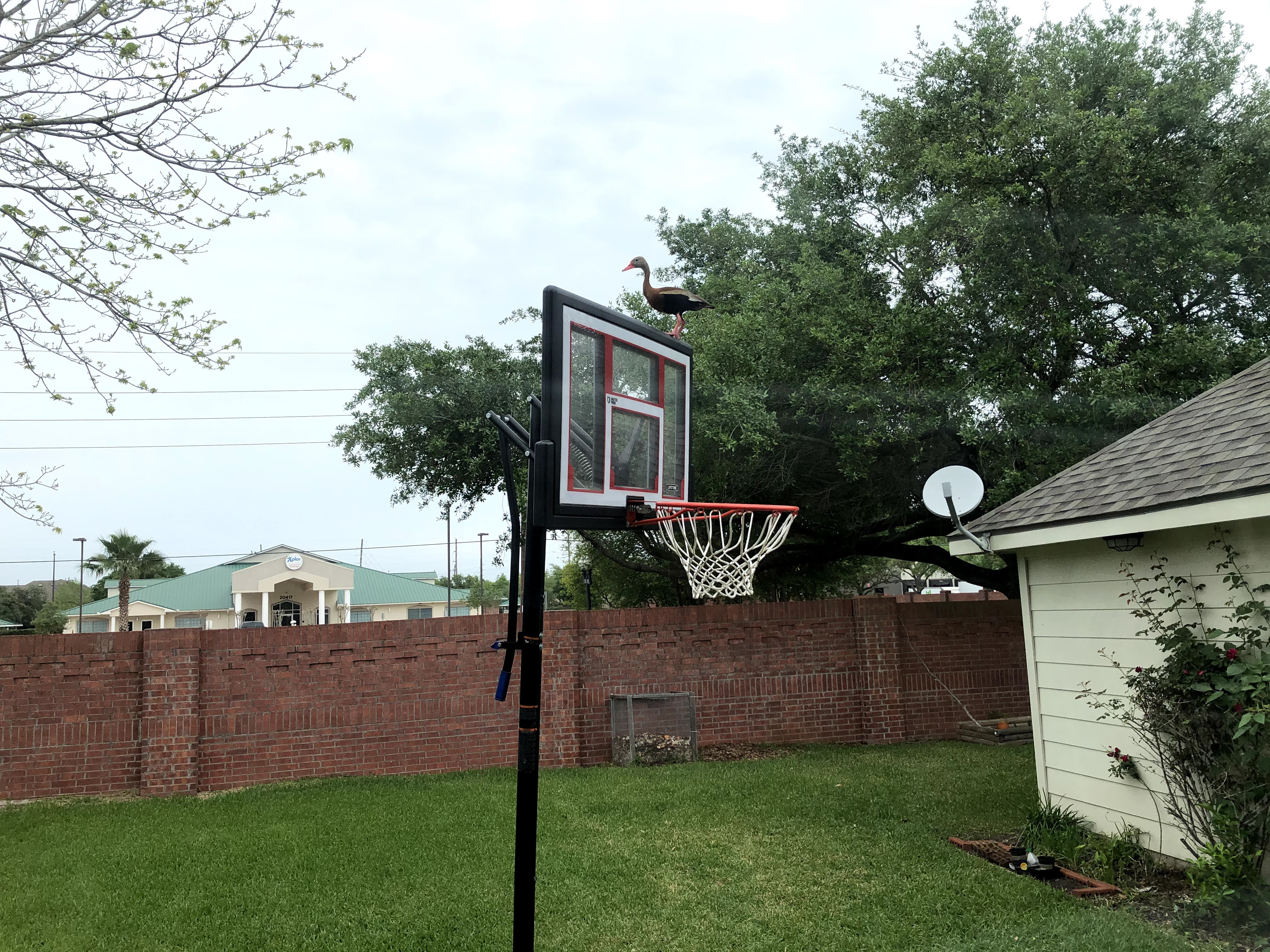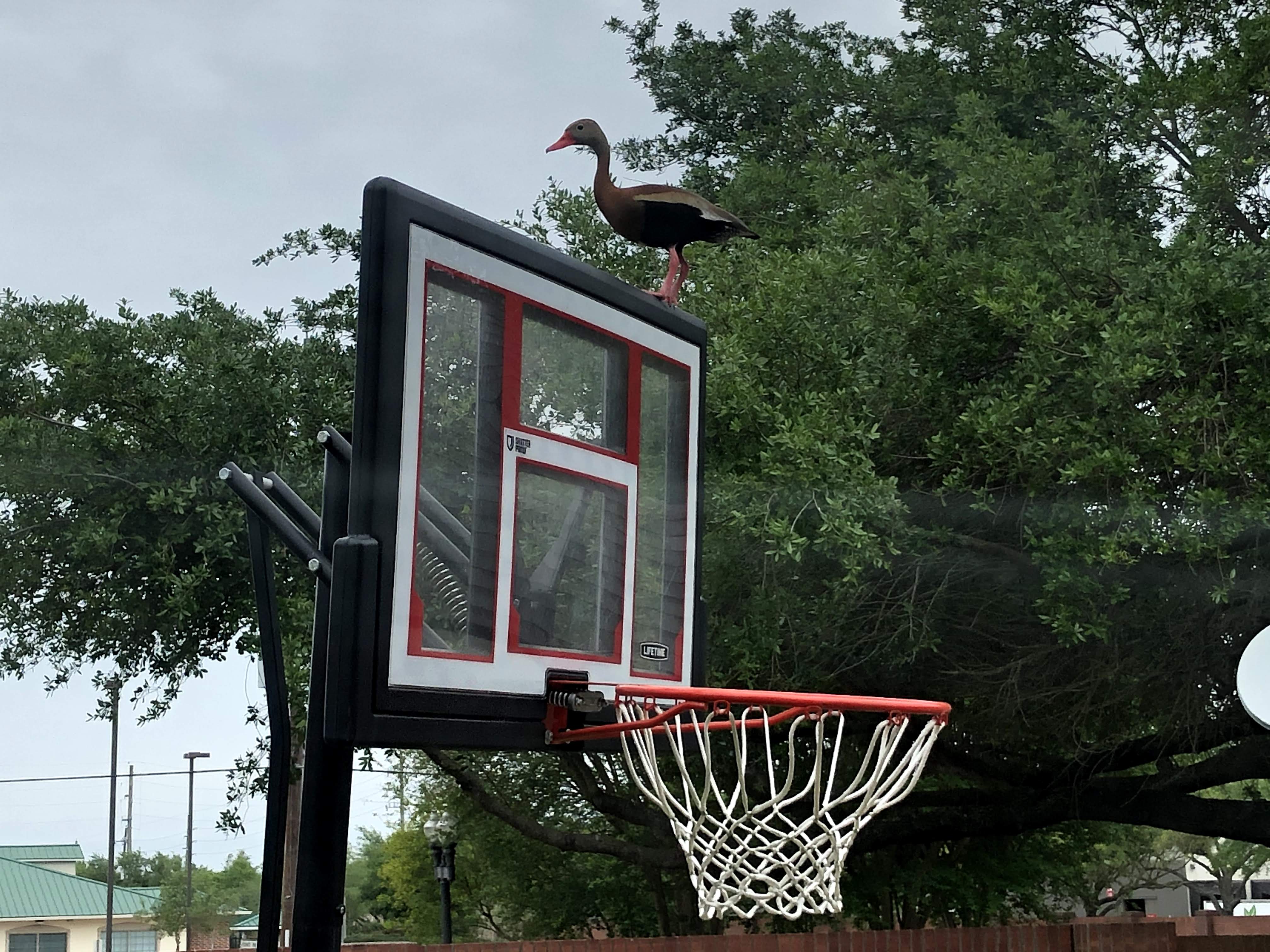 A duck flew into our backyard. Do you see it?